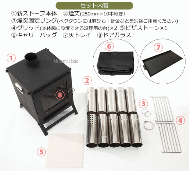(最終商品ページ更新日:2020年3月16日)商品サイズ 外寸:幅33.5×奥行36×高さ47cm燃焼室:幅30×奥行27×高さ26.5cm煙突径:直径80mm最大煙突長:2m 収納サイズ 幅33.5×奥行29×高さ39cm 重量(付属品込) 20kg セット内容 ・薪ストーブ本体・煙突(250mm×10本継ぎ)・煙突固定リング(ペグダウンには麻ひも・針金などを別途ご用意下さい)・グリッド(本体脇に設置できる調理用の台)×2・ピザストーン×1・キャリーバッグ・灰トレイ・ドアガラス 材質 本体・灰トレイ:鉄煙突、煙突固定リング、グリット:ステンレススチールピザストーン:セラミック 保証について ご購入日より6ヶ月を保証期間と致します。